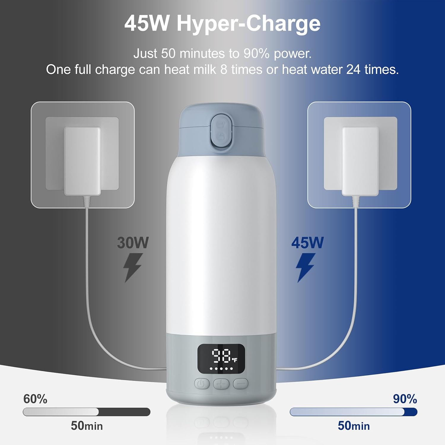 • 45W Fast Charging & Long-Lasting Battery: Equipped with a 45W fast-charging adapter, this milk warmer fully charges in just 70 minutes. The built-in 10400mAh high-capacity battery supports over 8 uses, eliminating frequent recharging during busy routines or travel for all-day reliability
